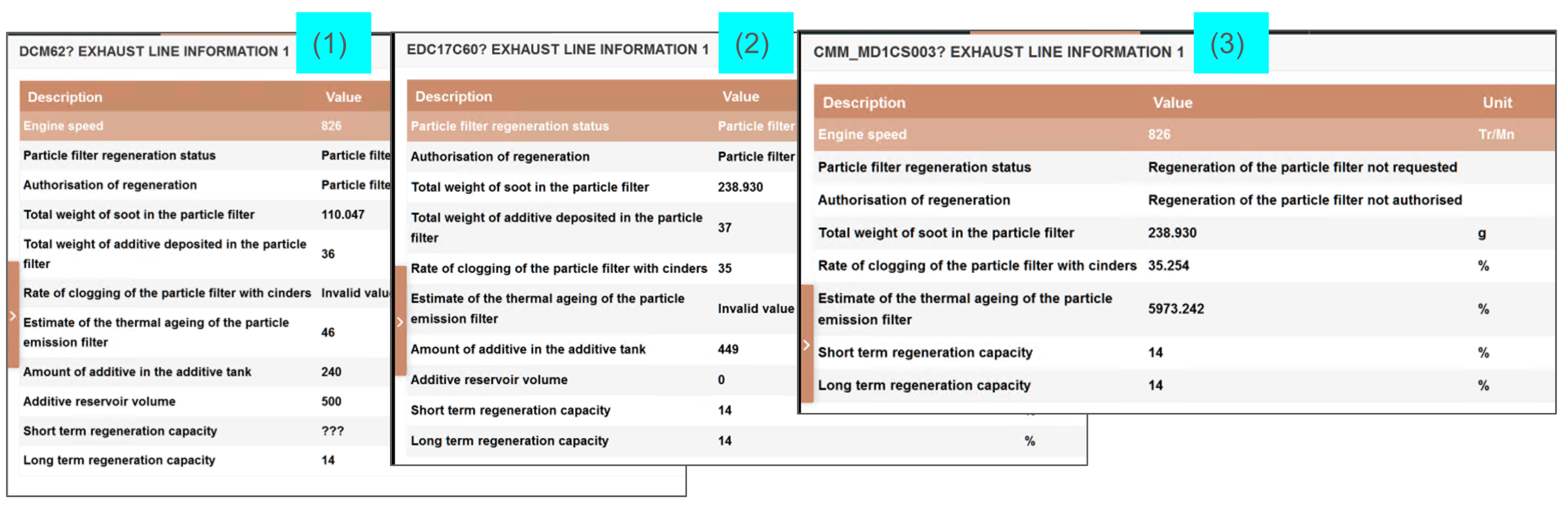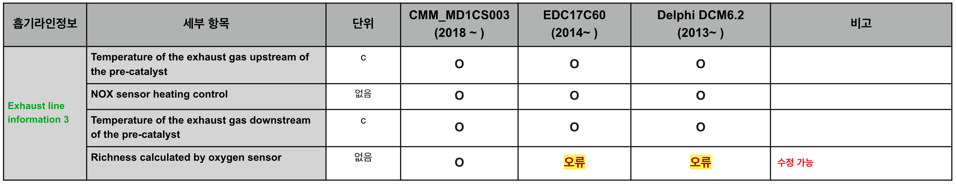 배기라인정보3(Exhaust line information3)의 경우 엔진 "NOx" 항목 제외시 ECU에서 수집하는 항목이 거의 같습니다.