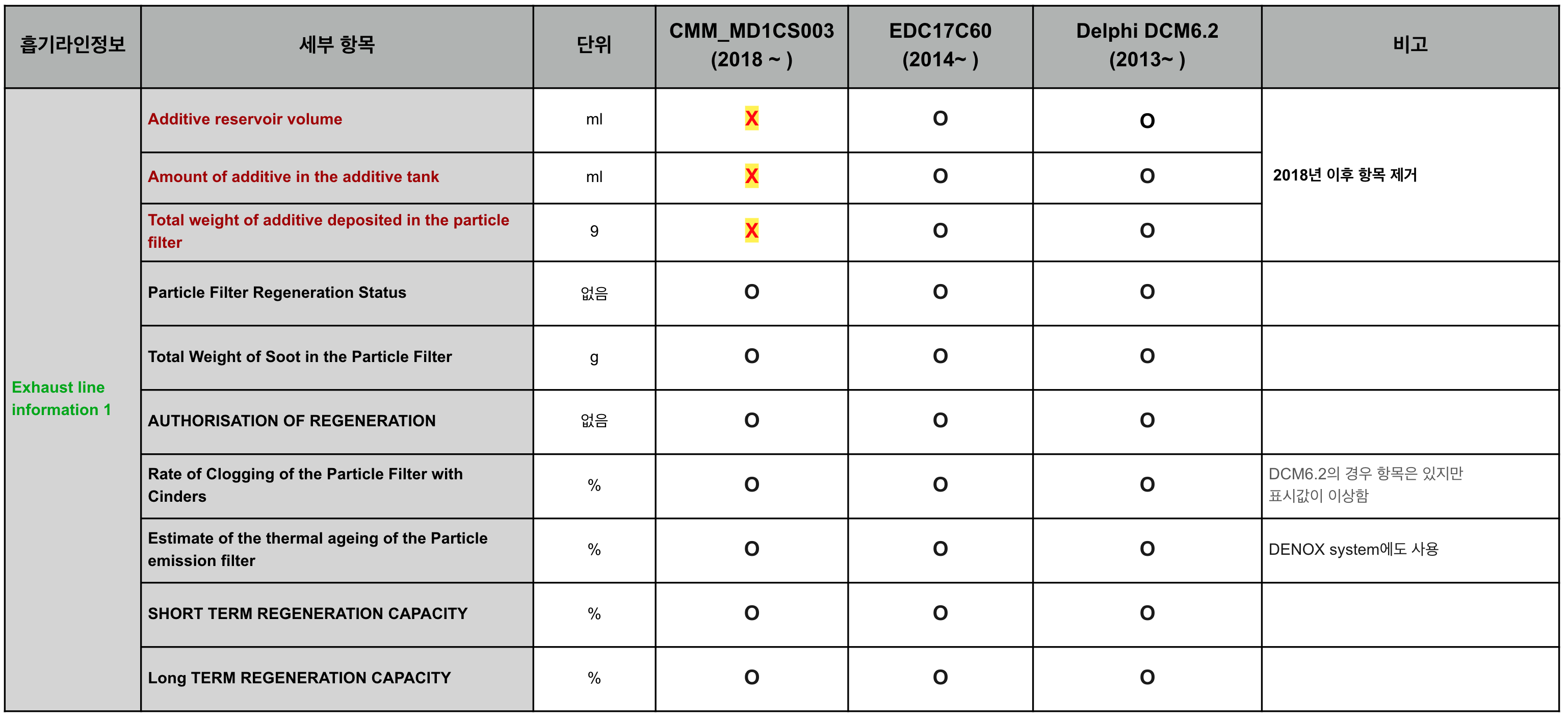 세부 내용중 특이한 부분은 "배기라인정보1"에서 1.5엔진 ECU인 CMM_MD1SC003부터는 DPF용액 탱크 크기와 잔량, 그리고 "파티클필터(분진필터)에 쌓인 첨가제의 총 무게" 3가지 항목은 삭제 되었습니다. (아래 x 표시 참조)