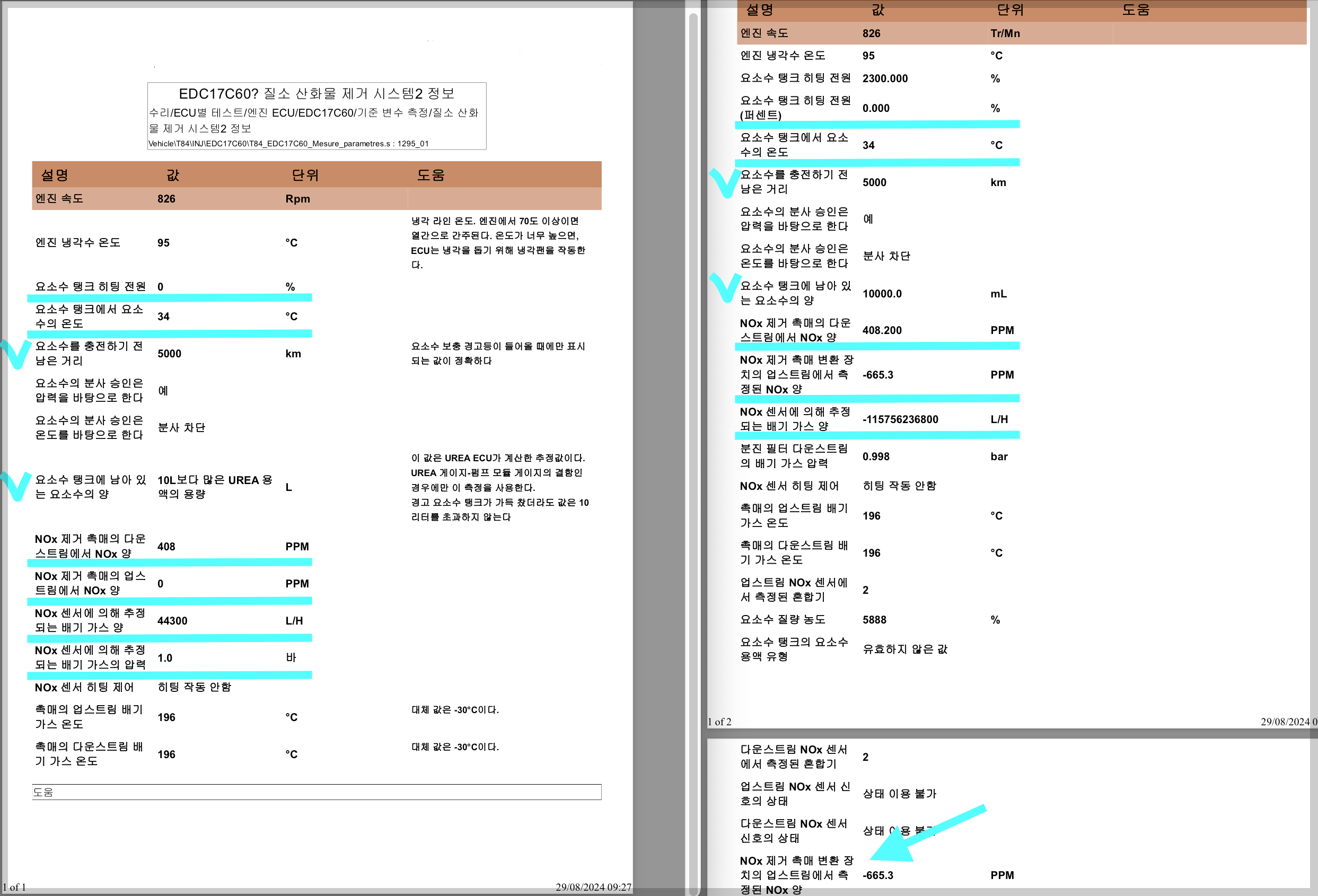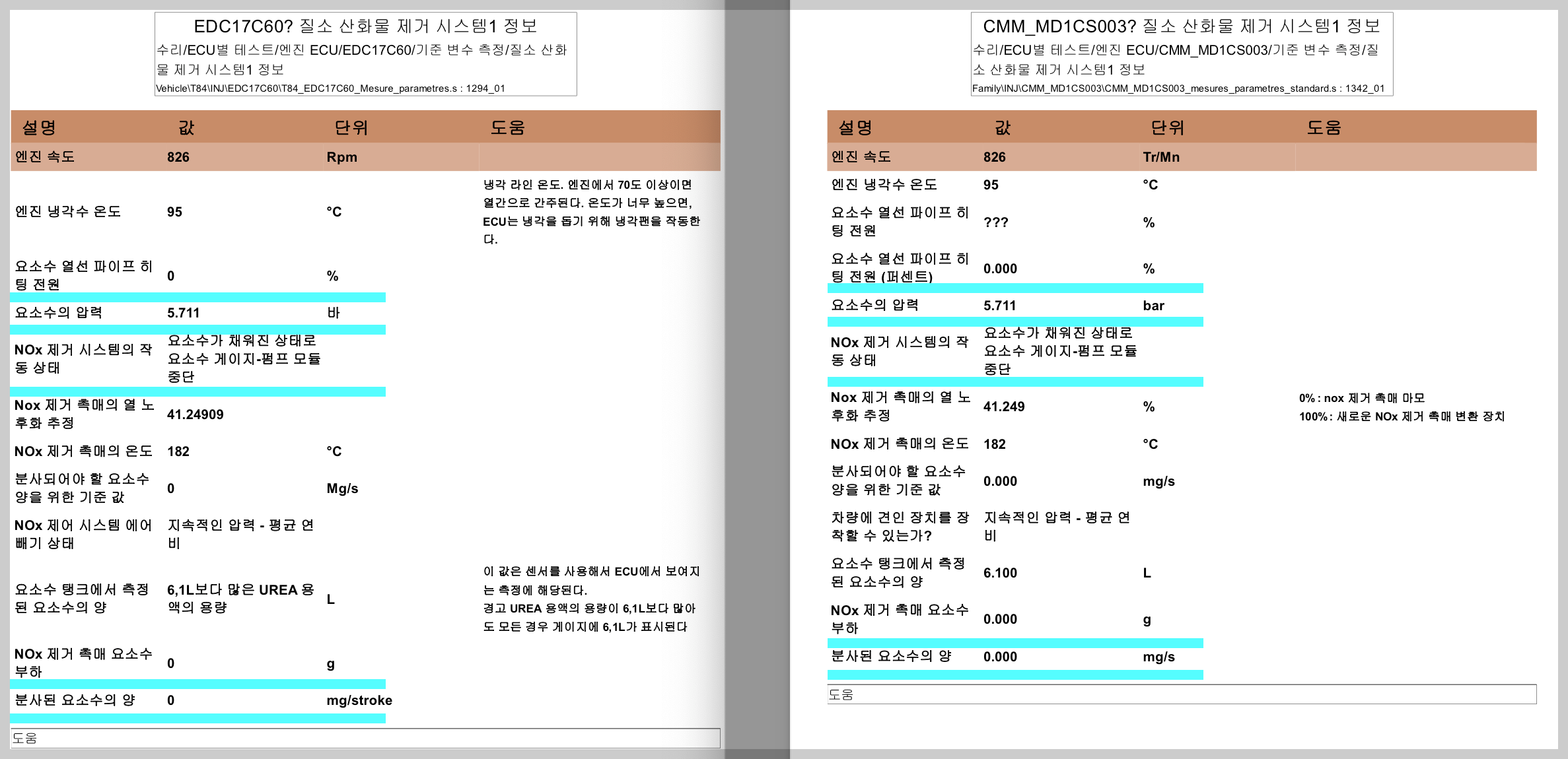 Diagbox 9.91에서 DENOx 시스템 정보(질소 산화물 제거 시스템 정보)1,2 비교해봤습니다.