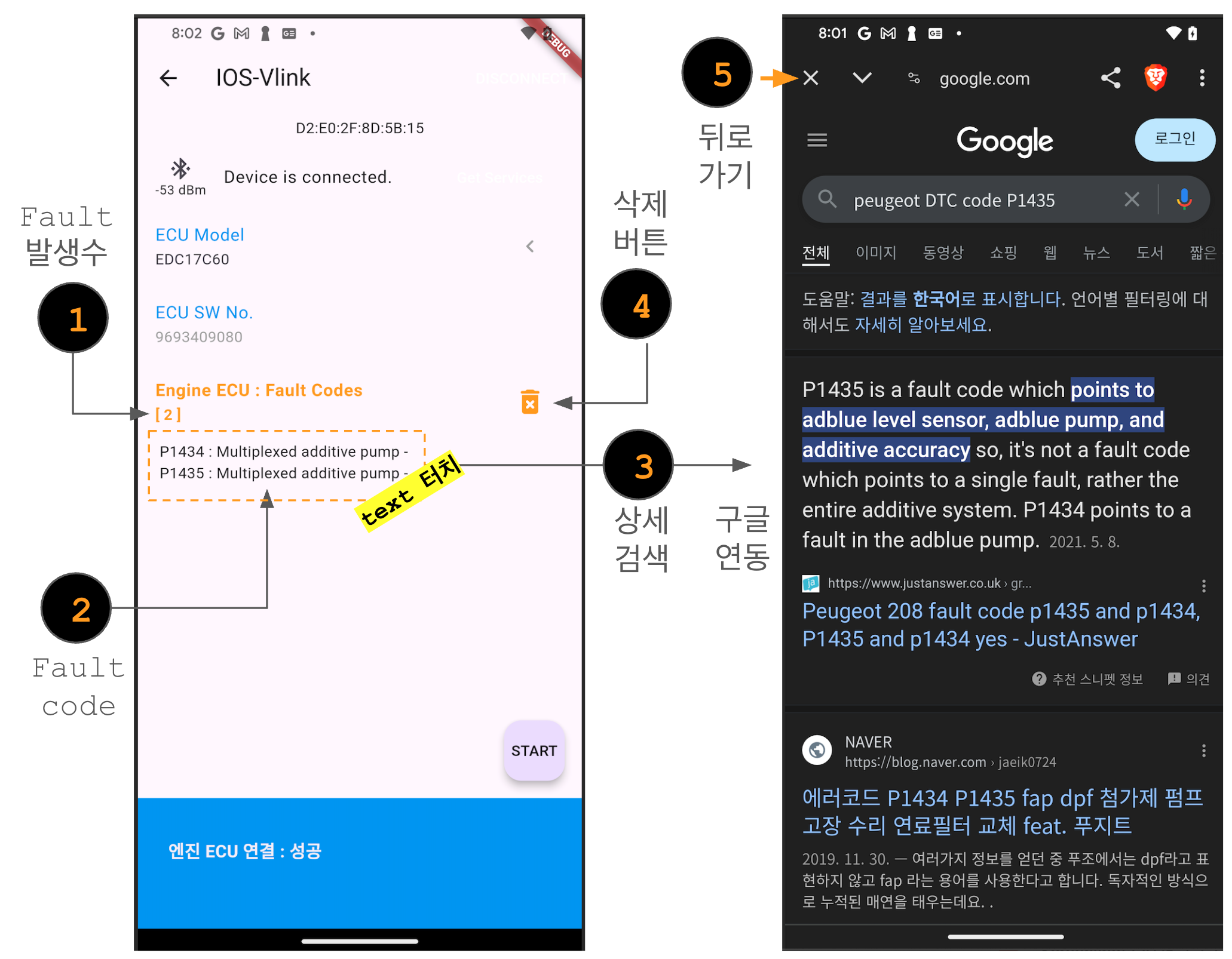 아래처럼 결함이 발생한 경우 텍스트 부분 터치하면 바로 구글 검색 결과로 즉시 보여줍니다. 이기능은 다른 OBD앱에서 있었던 것을 참고해서 넣었습니다. 다양한 사례나 유사 현상에 대한 동영상 참조가 가능하니 유용하게 활용 가능합니다.