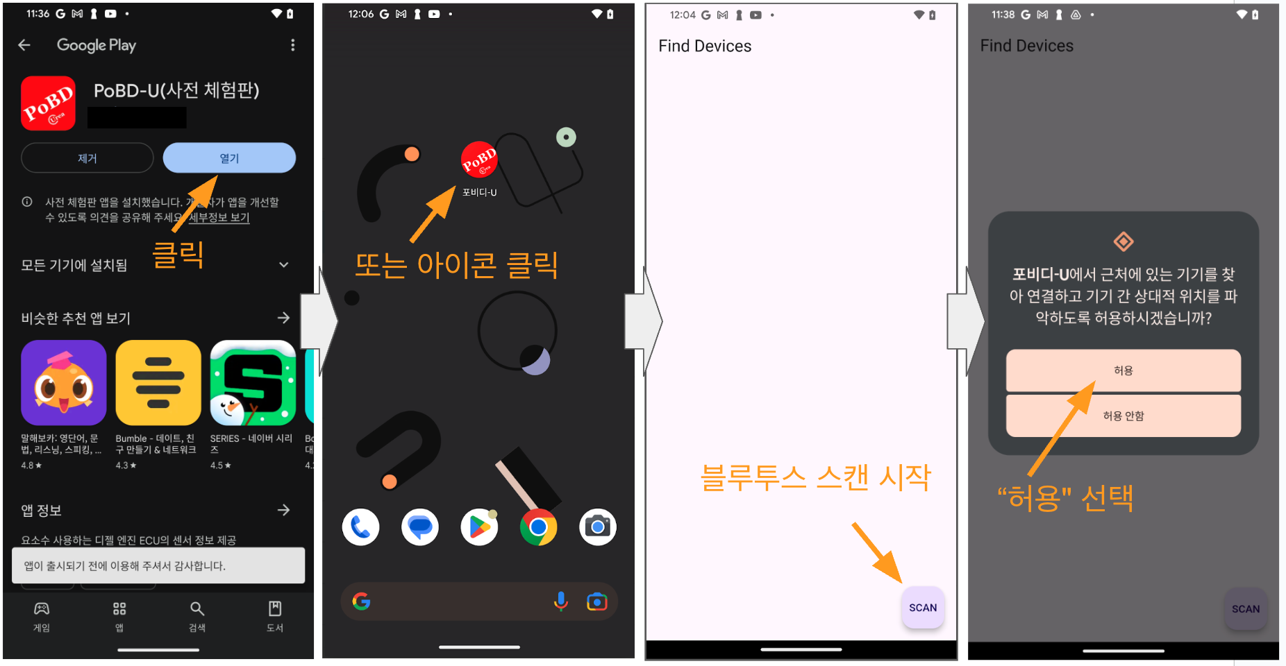 앱이 열린후 "SCAN"버튼 누루면 블루투스 권한 요청 메뉴가 나오는데 "허용"으로 선택하셔야 앱이 시작됩니다.