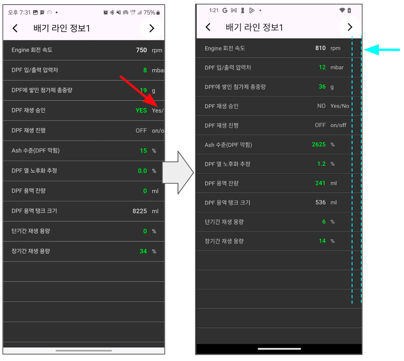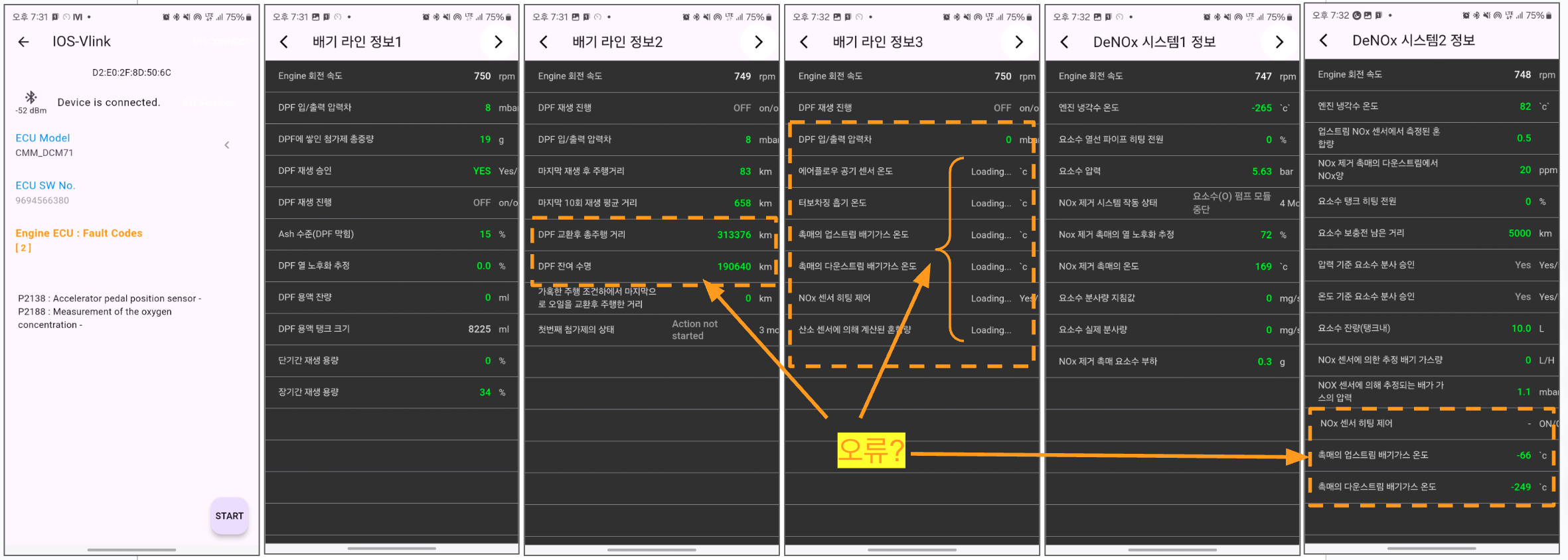 어이없게도 배기라인 정보3에서 "Loading..."으로 표기되는 부분은 예외처리 코드 누락해서 생긴것이였습니다. 그밖의 항목은 엔진 ECU마다 계산 방식 차이가 나는것을 수정 반영하여 해결했습니다.