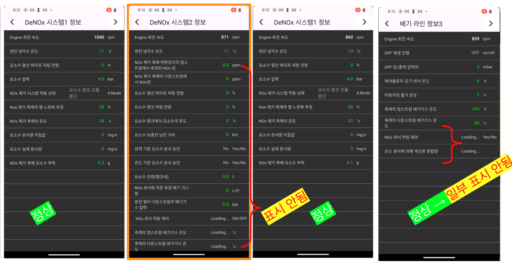 1) DeNOx 시스템2 정보 페이지로 이동시 특정 센서부터 값 표시 안됨