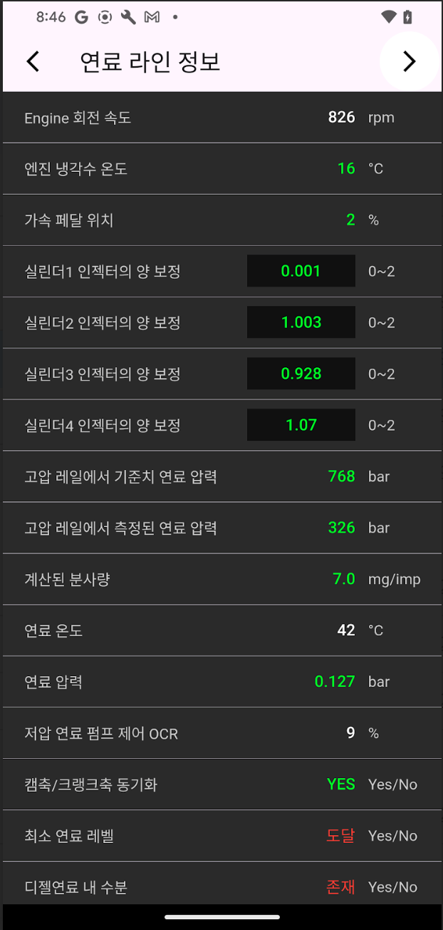 비요소수 차량인 저의 푸조 508은 인젝터에서 연료 주입되는 시간까지 표시되었는데, 최신 차량들은 더 이상 제공하지 않는것으로 확인됩니다. 그나마 실린더 인젝터 플로우 량 보정값이 나와서 다행이긴합니다.