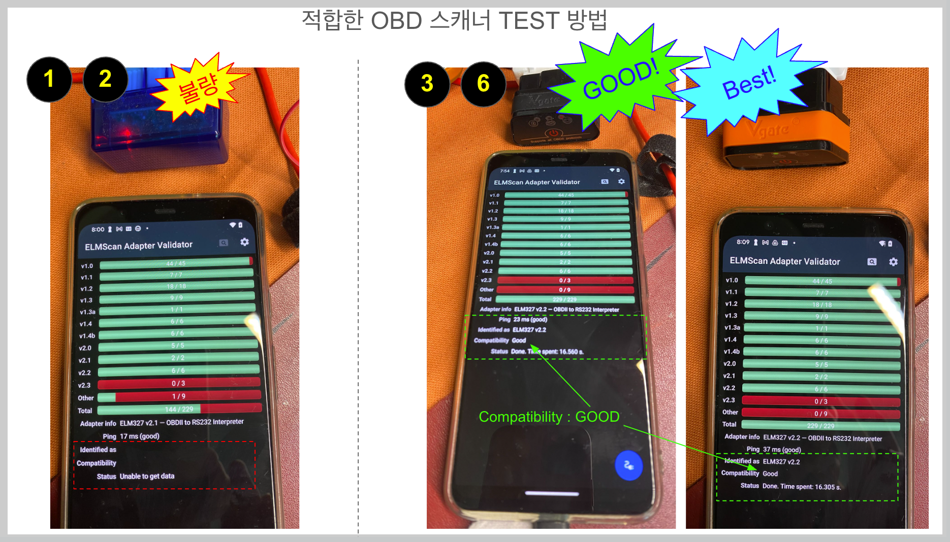 정상인 경우, ELM327버전과 Compatibility : GOOD, Status Done이라고 표시됩니다. (아래 우측 사진)