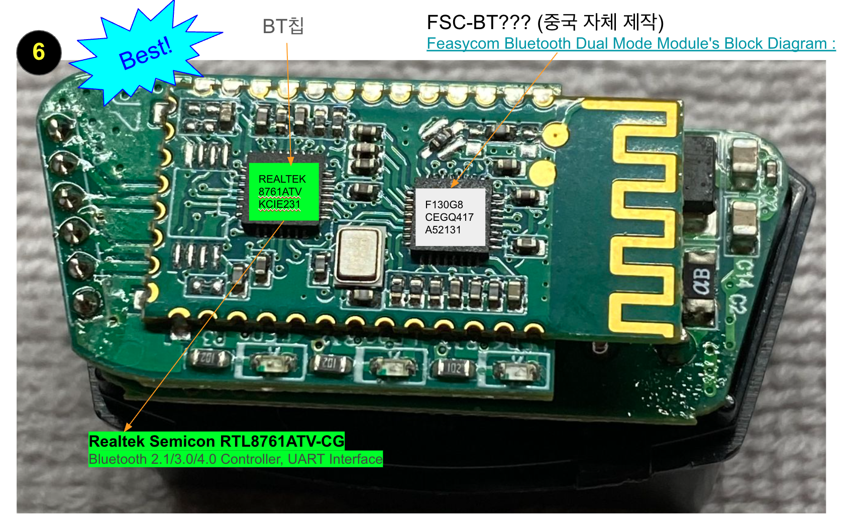 정상적으로 동작하는 (6)번 제품의 경우 BT(블루투스)칩도 REALTEK사 제품을 사용하는 것으로 확인이됩니다.(아래 사진 참조). 그래서 그런지 BT연결도 쉽게 이루어지고 잘 끊어지지 않습니다. 일부 부품은 중국에서 생산한 제품을 사용하지만 SEPC이 공개된 것을 사용하는것으로 확인됩니다.