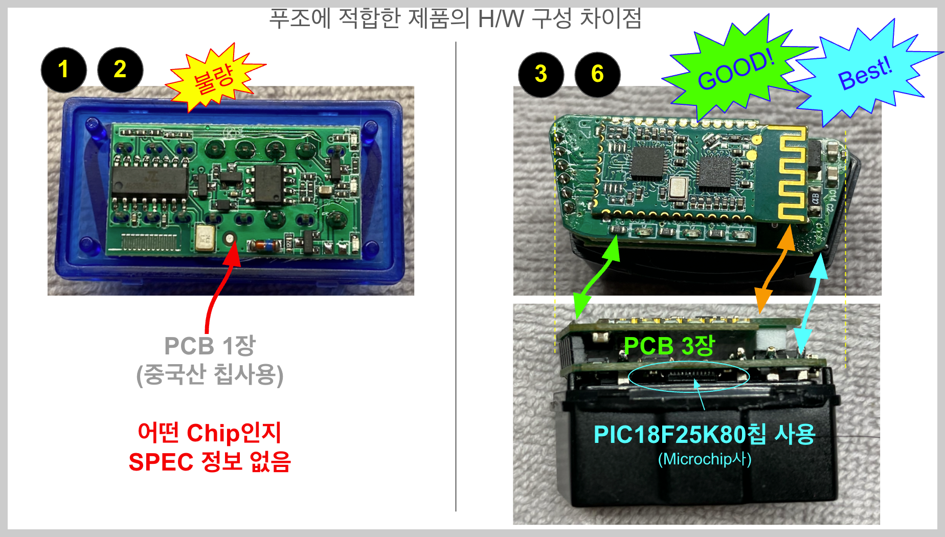 (아래 좌측 그림 - 불량품)(1),(2) 제품은 PCB가 1장으로 구성되어있고, BT와 ELM327칩과 동일한 기능을 하는 칩이 하나로 되어 있고(data sheet 미공개된 출처를 알 수 없는 칩사용),
