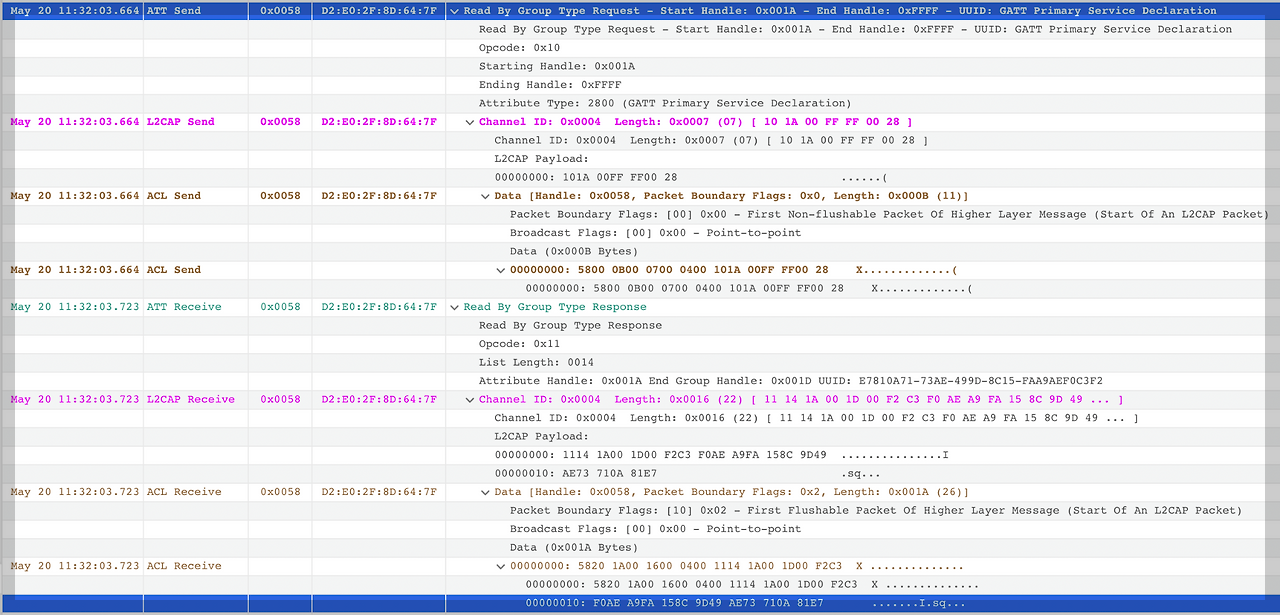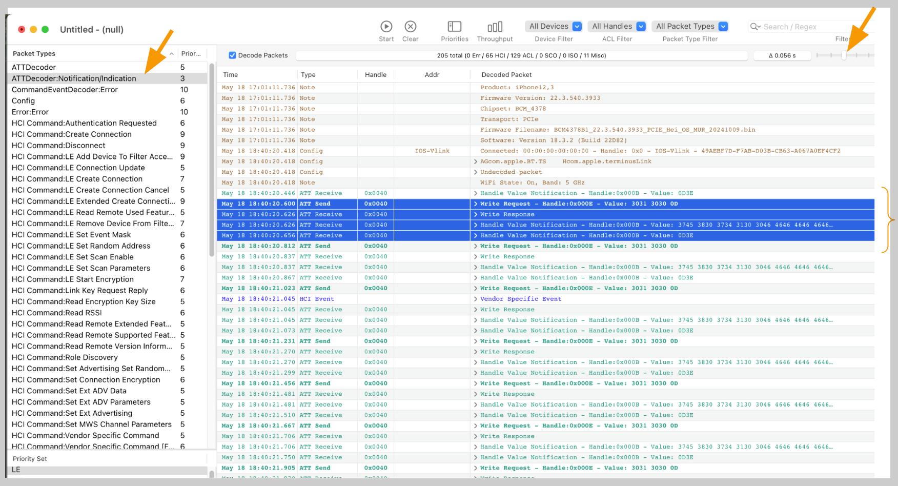 - PacketLogger 실행 결과(아래) : BT4관련 주고 받은 모든 명령들과 내용 표시됨