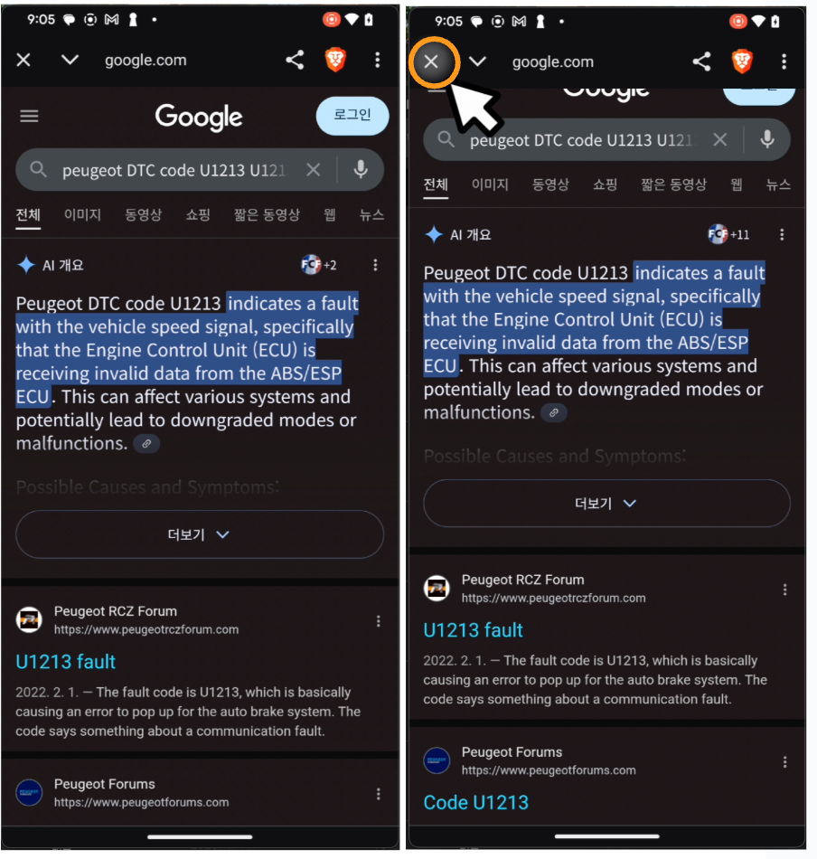 결함코드 검색시 별도의 키워드가 필요없이 바로 검색 가능하고, PoBD-U앱으로 되돌아 오려면 아래 우측 사진처럼 우측 상단의 "X"버튼을 누루면 이전화면으로 이동합니다.