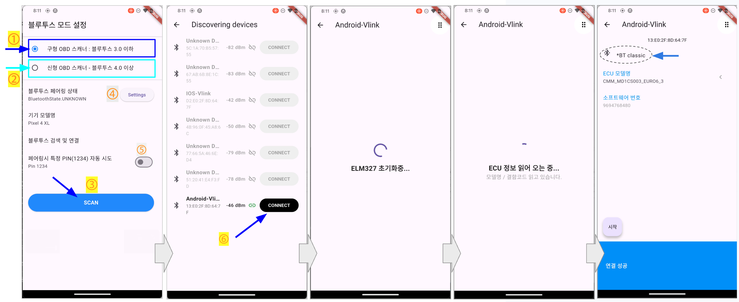 안드로이드 OS 스마트폰 경우 아래와 같이 "블루투스 모드 설정" 화면 통해서 연결 방법 선택 가능하며 기본 모드는 "구형 OBD 스캐너" 모드 입니다.