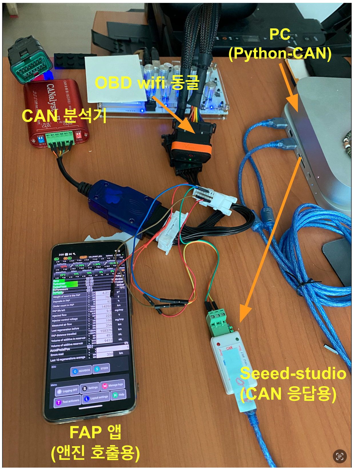 2) 위에서 작성한 코드들이 동작하는 PC(Python-CAN으로 동작하는 가상 ECU)와 연결된 Seeed studio CAN 분석기 출력을 통해 OBD2 CAN 신호선과 연결됩니다.