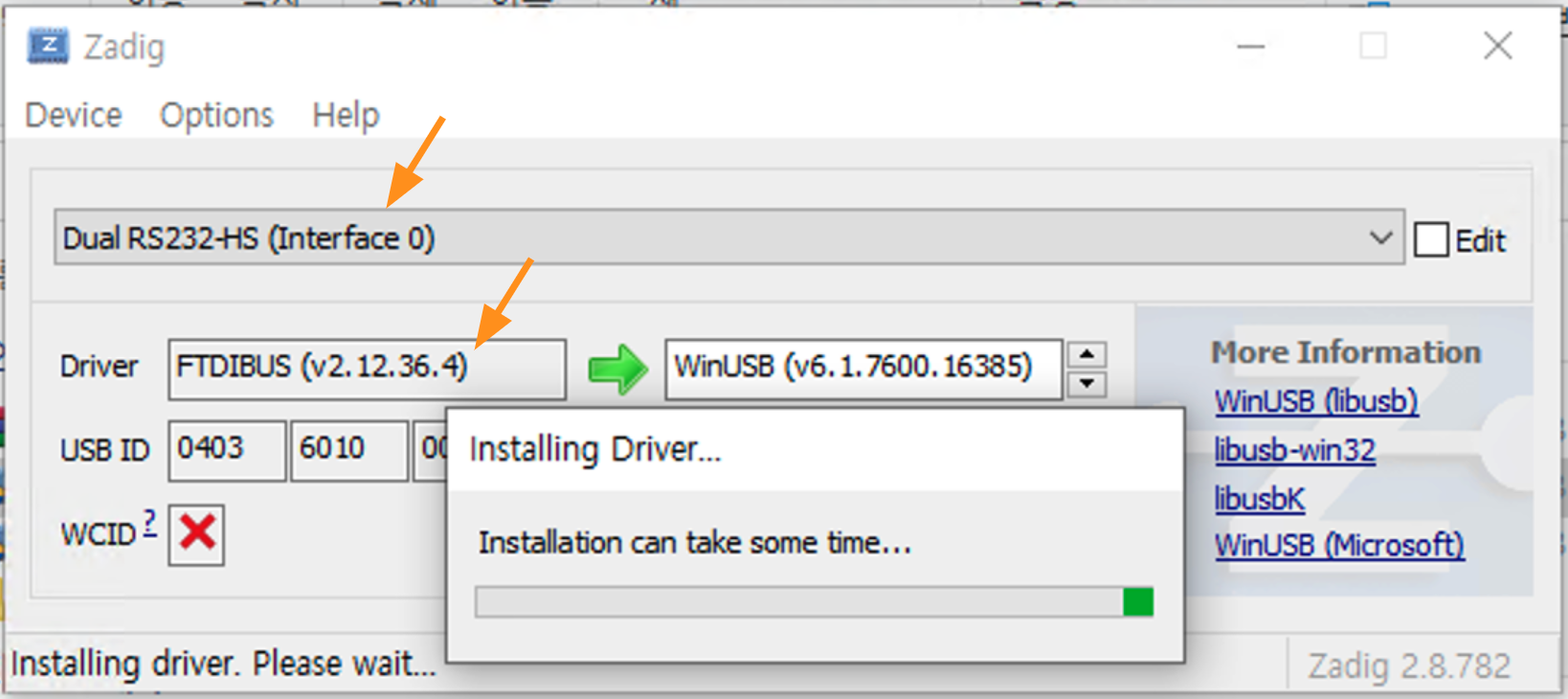 (윈도우즈) ftdi 드라이버 설치 → Zadig → Dual RS232-HS(interface 0) 선택 → FTDIBUS 확인!!!!
