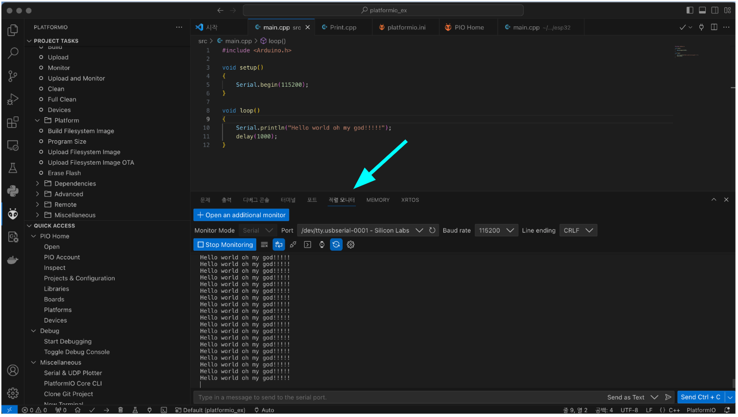4. 시리얼 모니터도 Visual studio code것으로 사용하면 됩니다.