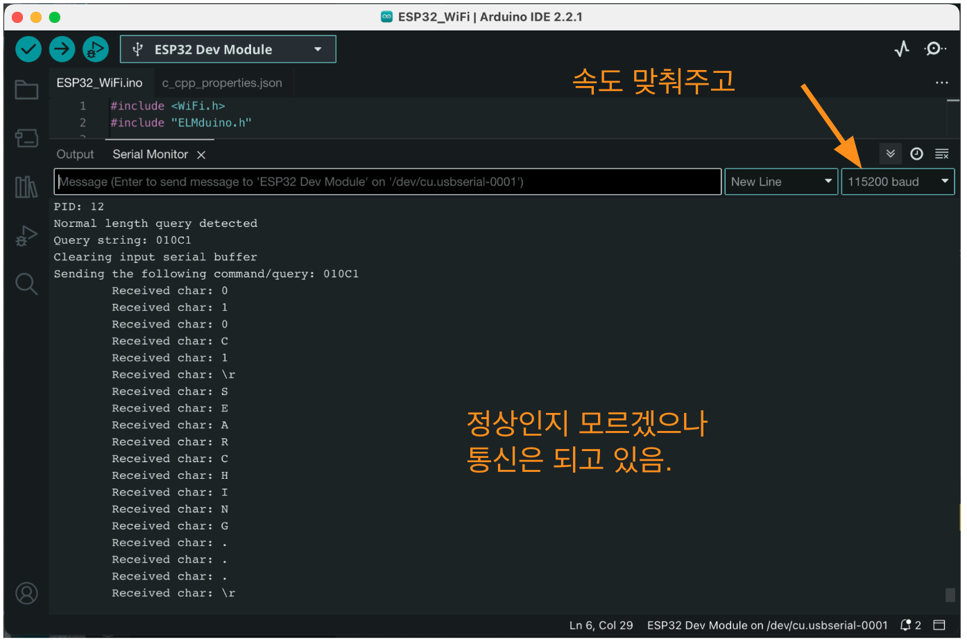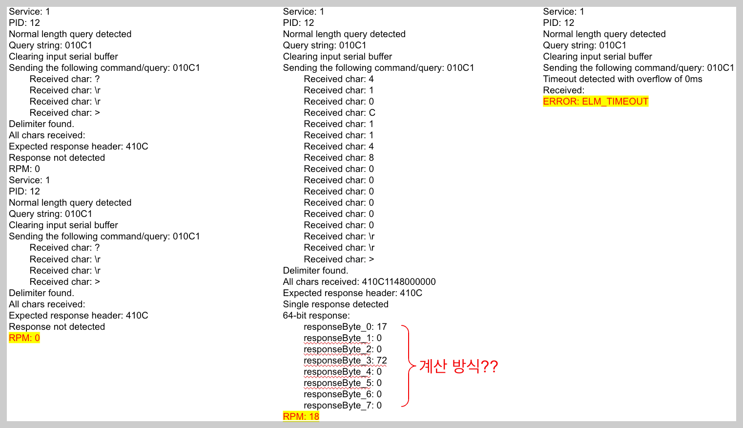 (이상한것은 Python-OBD 학습할때는 010C만 쿼리로 보냈는데, ELMduino에서는 010C1을 보냅니다. 왜 그럴까?)