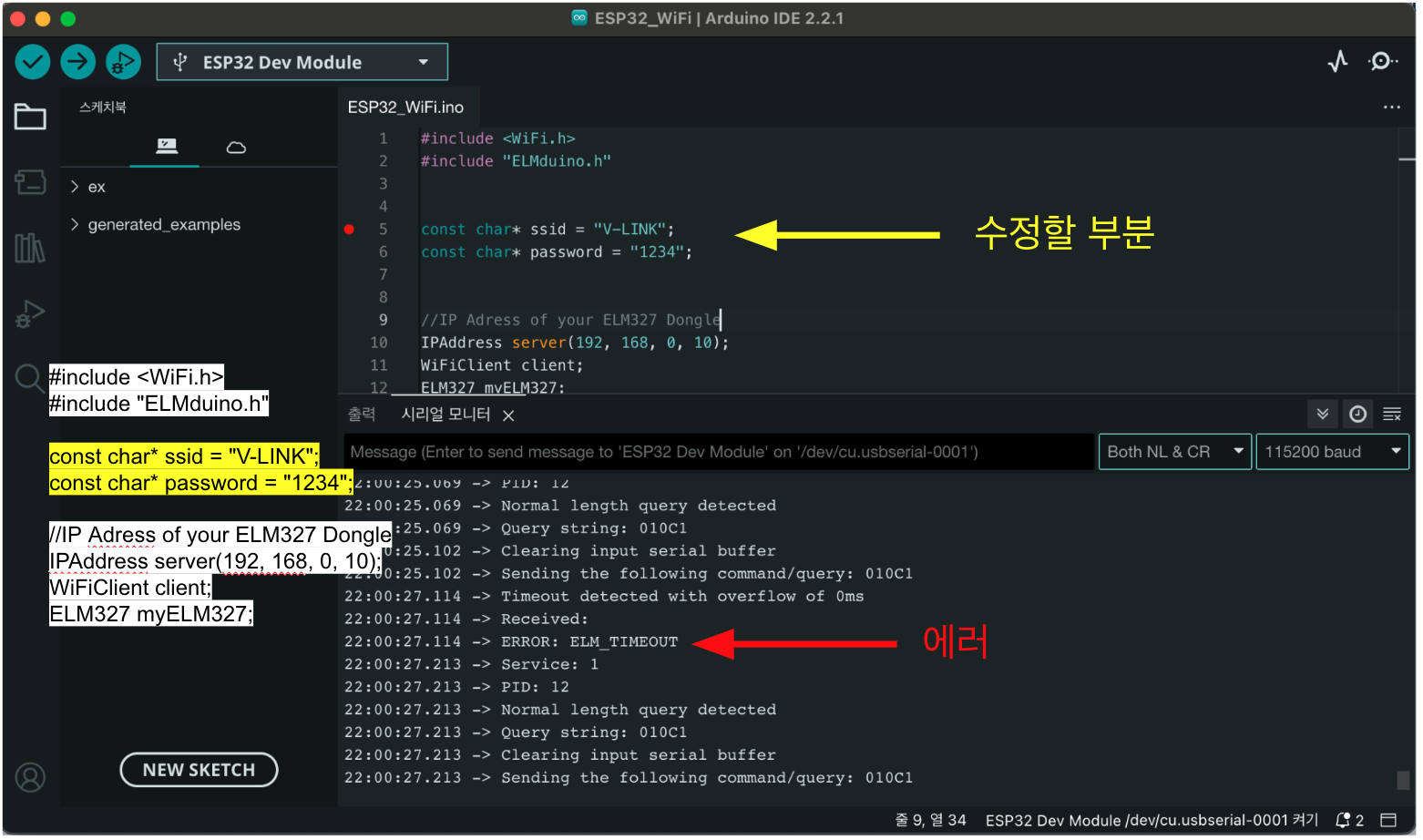 (변경코드) myELM327.begin(client, true, 2000, ISO_15765_11_BIT_500_KBAUD);
