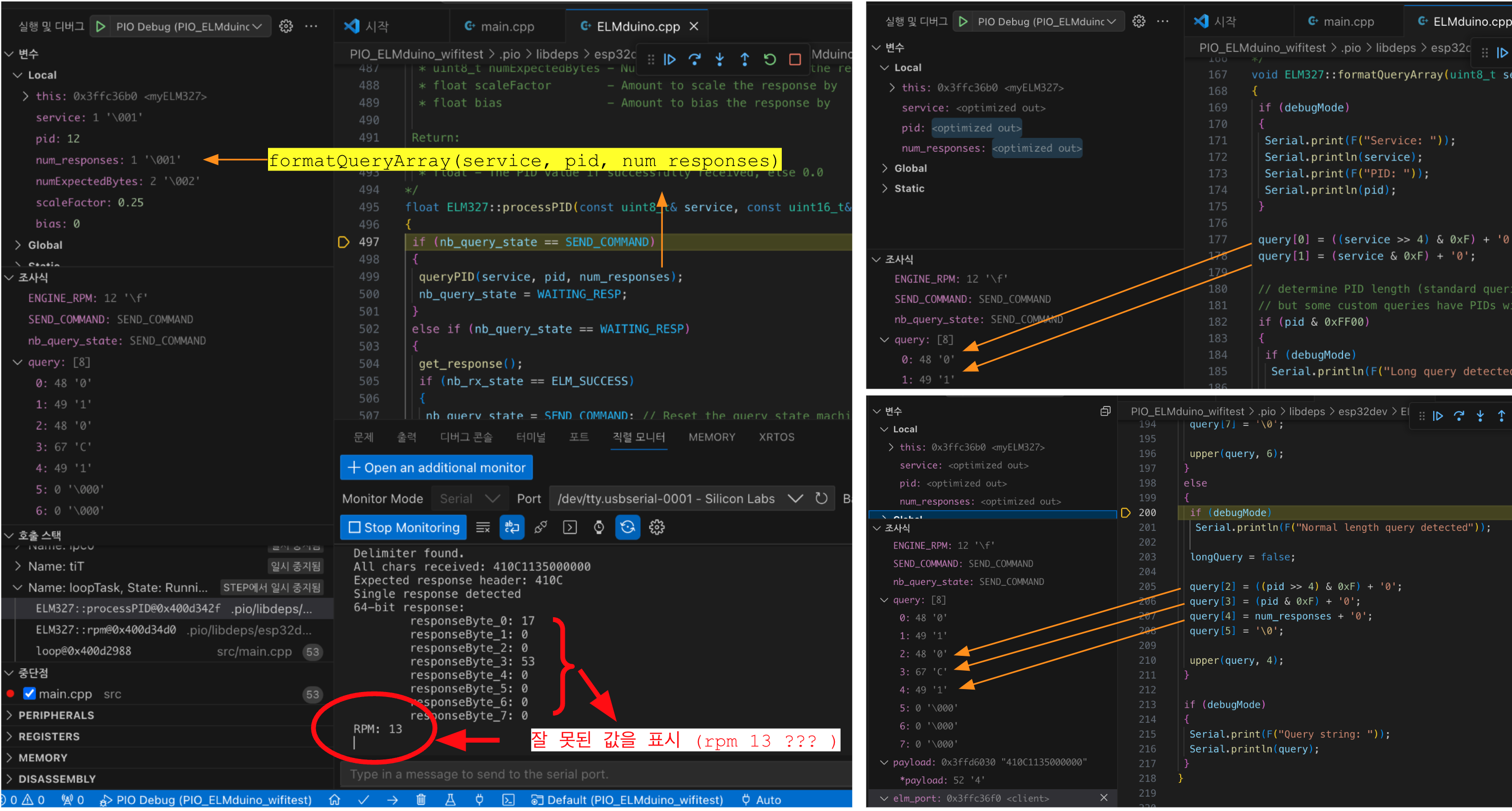 즉, OBDII 동글의 ELM327칩에서는 올바른 값을 보내주는데, ELMduino에서 잘 못 처리하고 있었습니다.