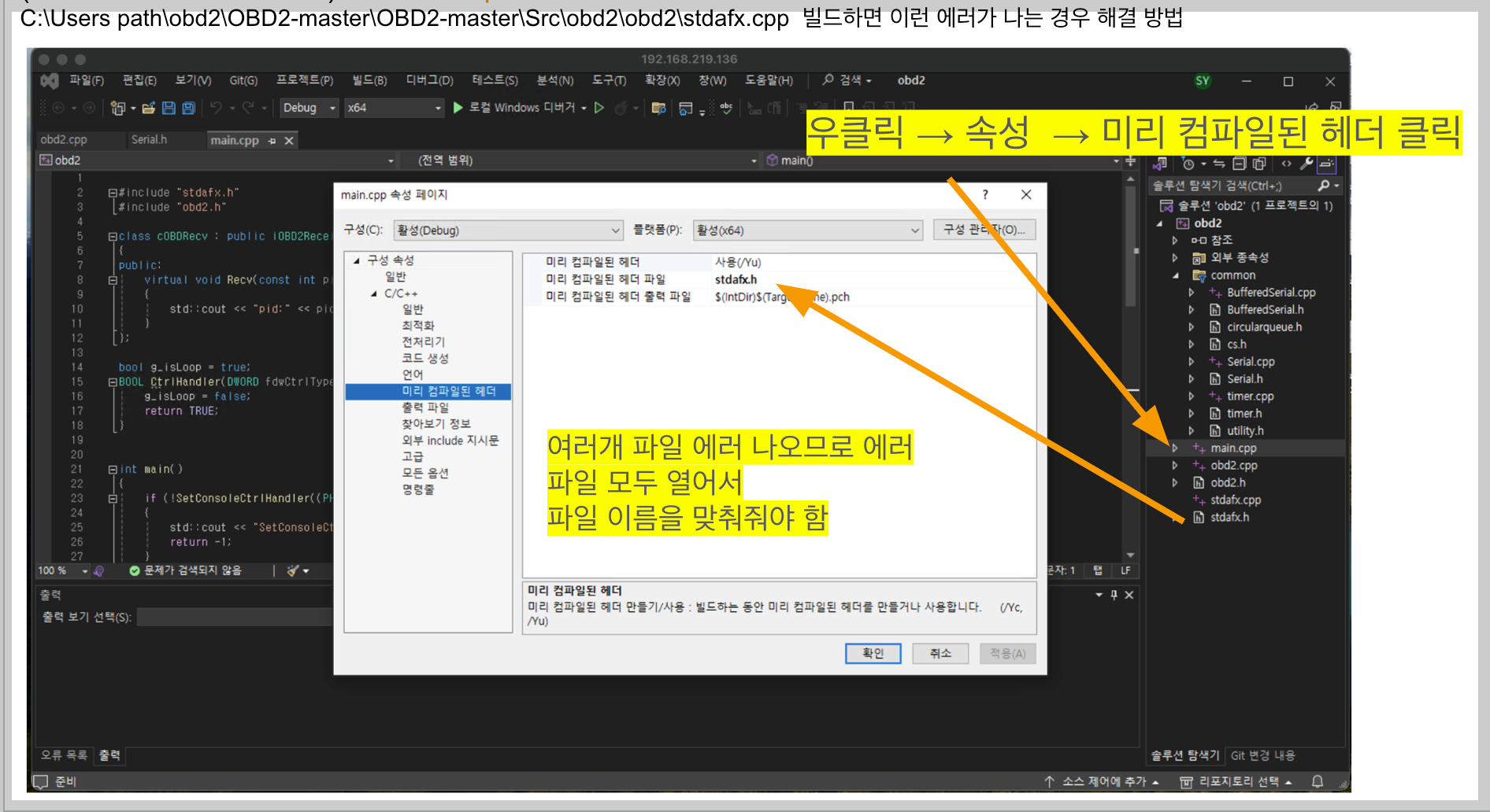 main.cpp에서 우클릭하여 속성에서 미리 컴파일된 헤더 클릭후 파일 이름을 일치시켜야 합니다. (위의 사진 참조)