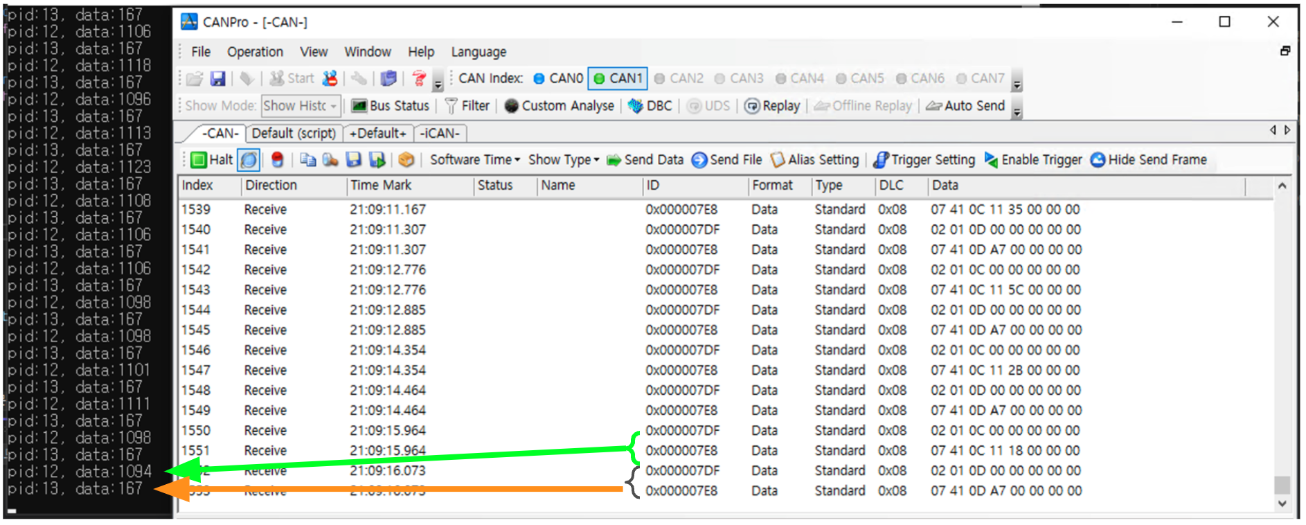 CAN 신호 분석기로 확인해봐도 정확하게 읽어 옵니다.