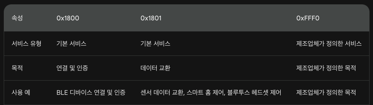 즉, 0x1800과 0x1801은 BLE 디바이스 간에 데이터를 교환하는 데 사용되는 기본 서비스입니다. 0xFFF0은 제조업체가 정의한 특정 서비스를 나타내므로, BLE 디바이스 간에 데이터를 교환하는 데 사용될 수도 있고, 다른 목적으로 사용될 수도 있습니다.