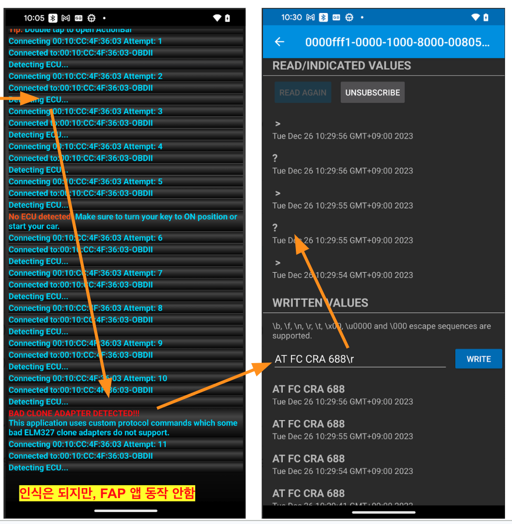 AT명령중 ELM327 1.4b command인 " FC CRA "명령 인식 못함. 즉 불량품이라는 것입니다.