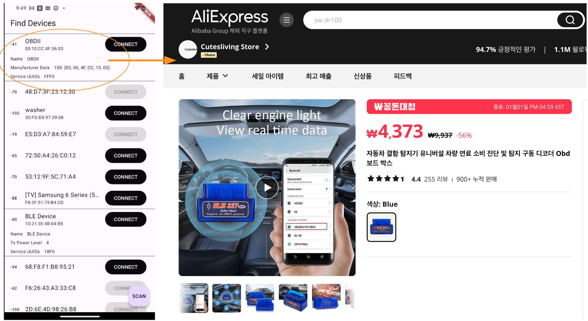 이번 실험에서 사용한 동글은 알리익스프레스에서 구매한 저렴한 OBDII 동글입니다.