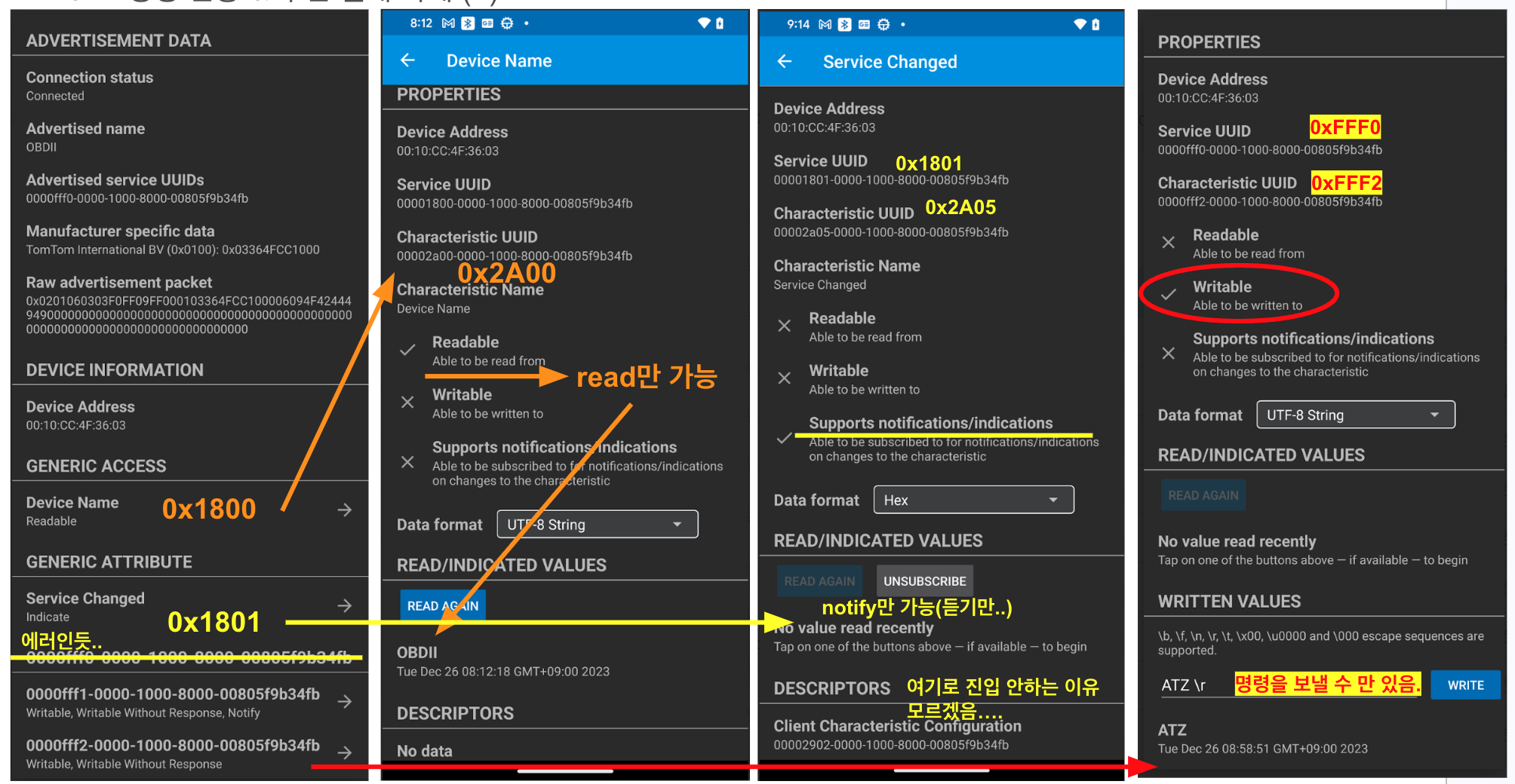 0x1800은 read 기능만 있고, 0x1801은 nofification 기능만 있습니다.