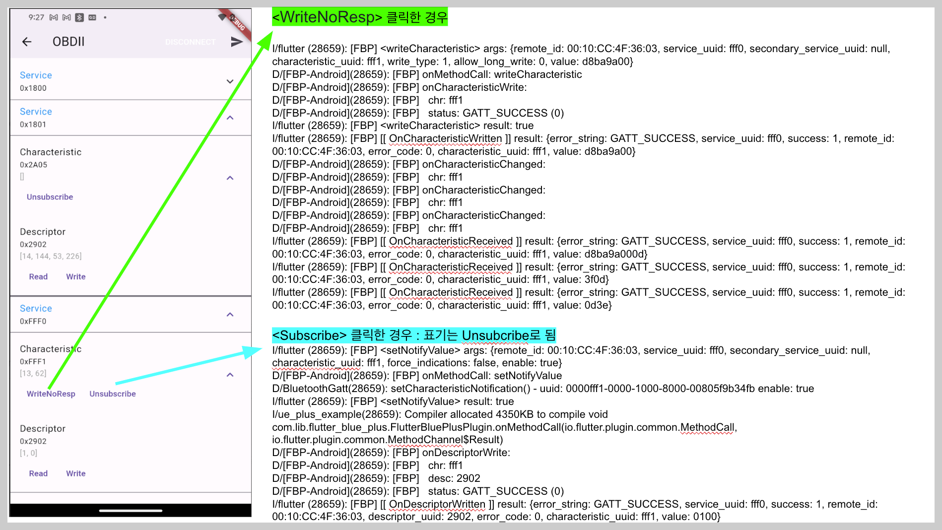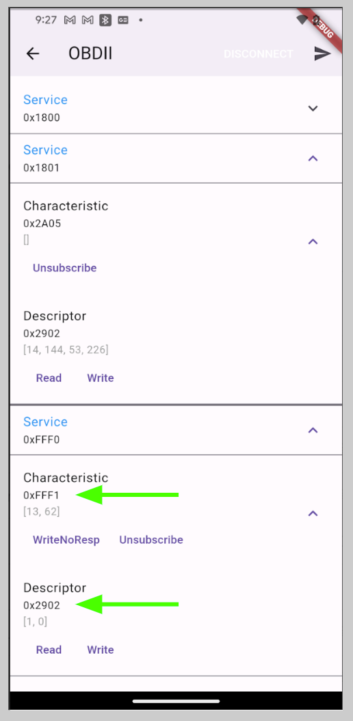 0xFFF1 (Characteristic)은 하위 메뉴에 0x2902 : Descriptor (read, write 기능있음)로 나눠지는데 OBD 통신으로 사용 가능한 것은 0xFFF1 : Characteristic입니다.