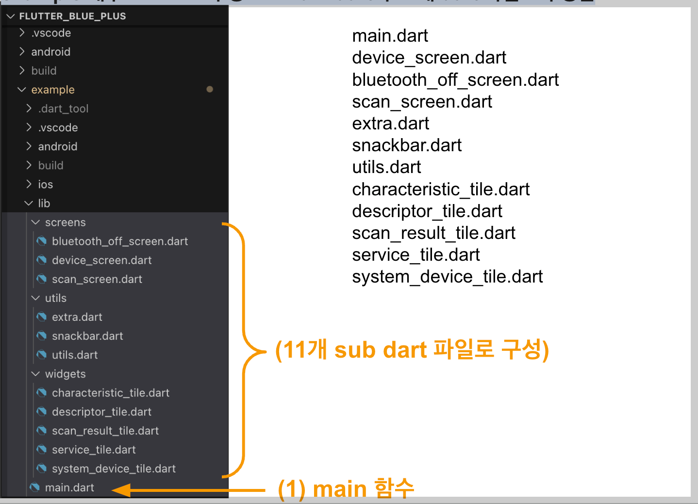 example 내부 소스 코드 구성 → main.dart외 11개 dart 파일로 구성됨