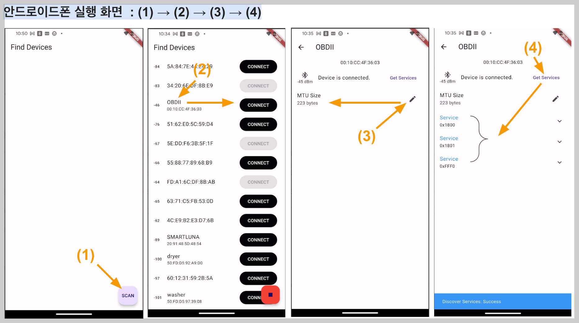 실행하면에서 (1)버튼은 BT 스킨 기능이며, (2)원하는 OBDII 동글과 연결합니다. (3)MTU 사이즈 변경, (4)서비스 종류 검색 기능입니다.