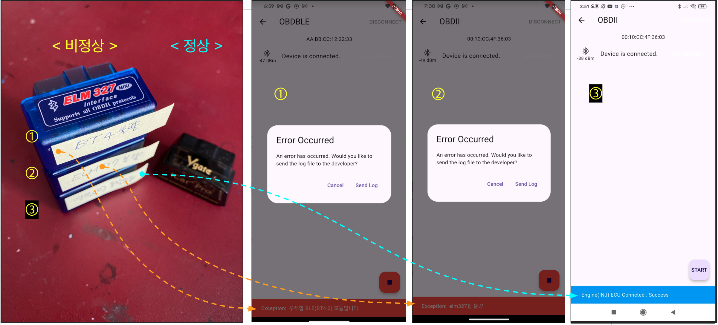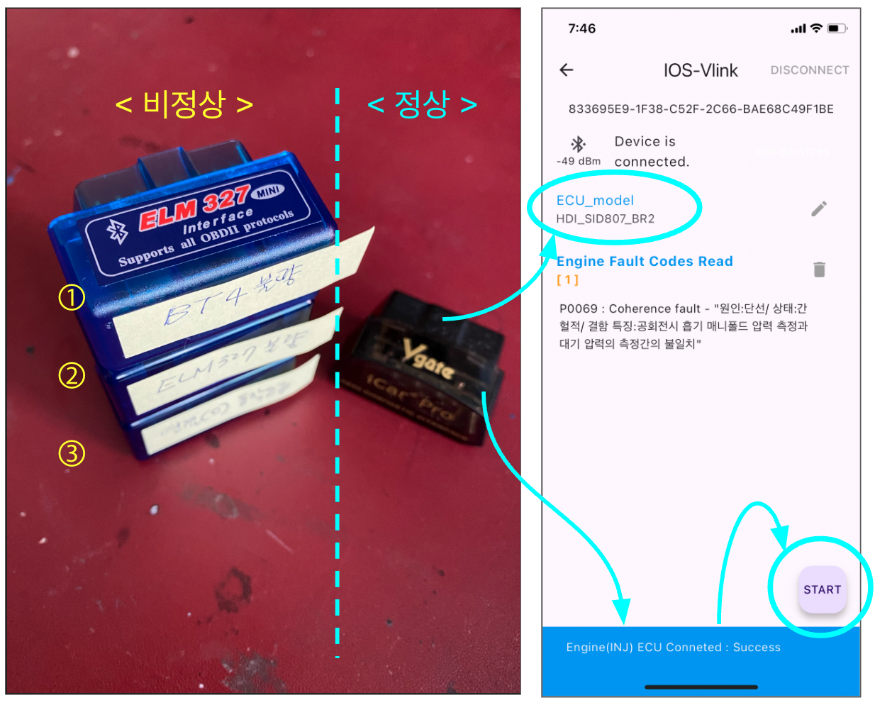 반면 파란색 케이스의 저가 OBD 스캐너는 온갖 문제를 발생시킵니다. (①,②,③)