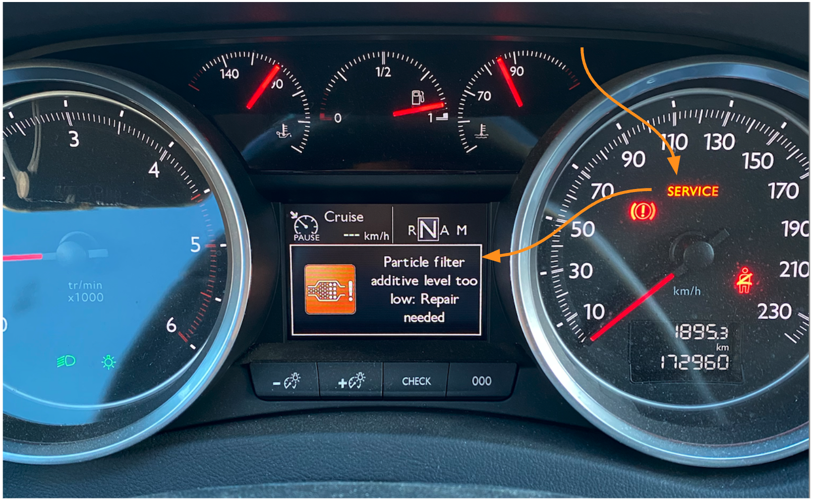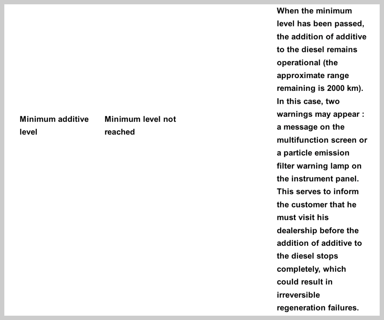 "최소 수준을 넘으면 디젤에 첨가제를 추가하는 것이 계속 작동합니다(남은 대략적인 주행 거리는 2000km입니다). 이 경우 다기능 화면의 메시지 또는 계기판의 입자 방출 필터 경고등이라는 두 가지 경고가 나타날 수 있습니다. 이는 디젤 엔진에 첨가제를 추가하는 작업이 완전히 중단되기 전에 대리점을 방문해야 하며 이로 인해 되돌릴 수 없는 재생 오류가 발생할 수 있음을 고객에게 알리는 역할을 합니다."