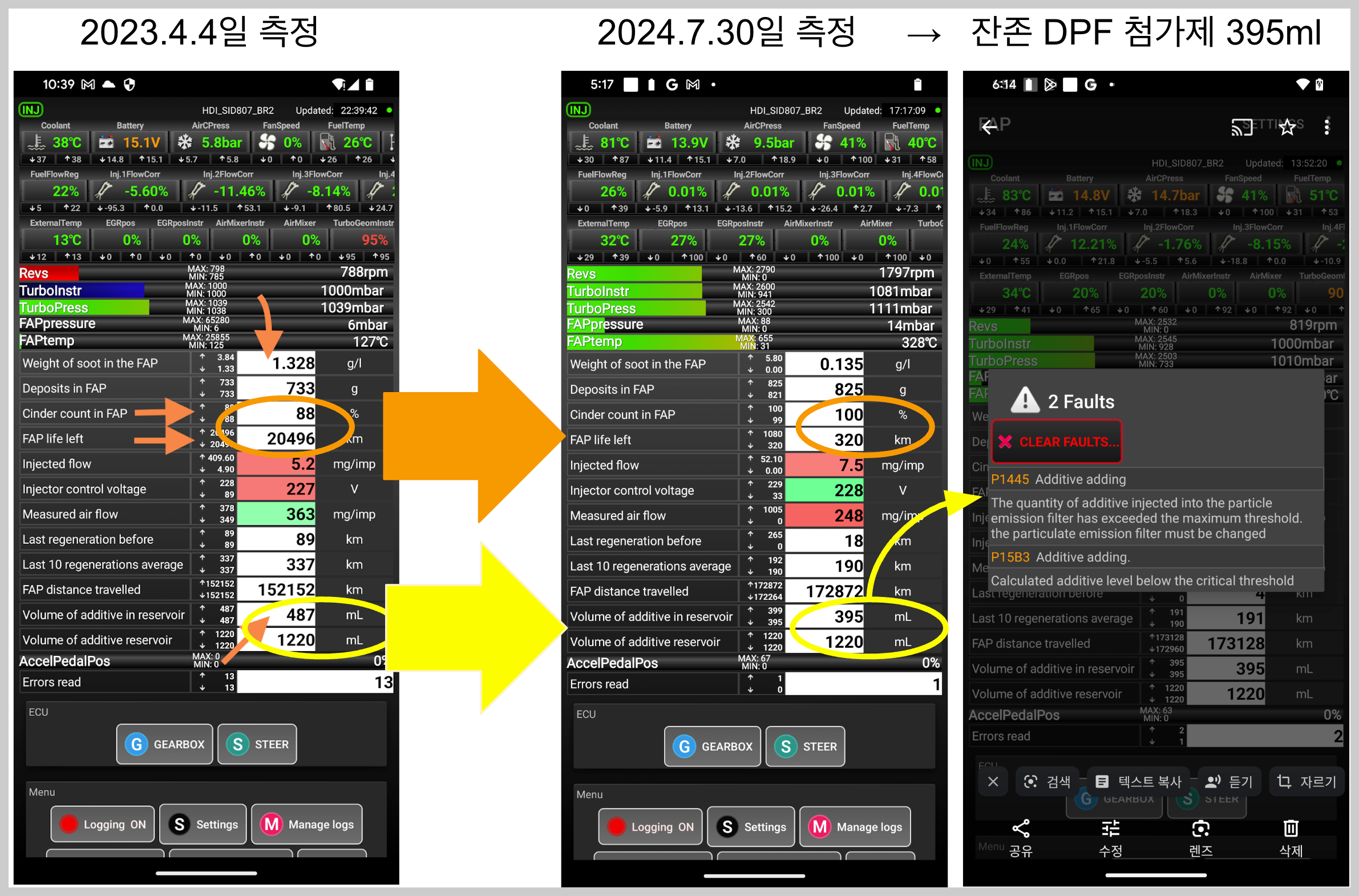 즉 DPF 잔존 수명이나, DPF 첨가제 잔존량등은 센서값이 아니고 ECU가 계산하는 것이므로 정확한 값이 아닌것으로 추정됩니다.