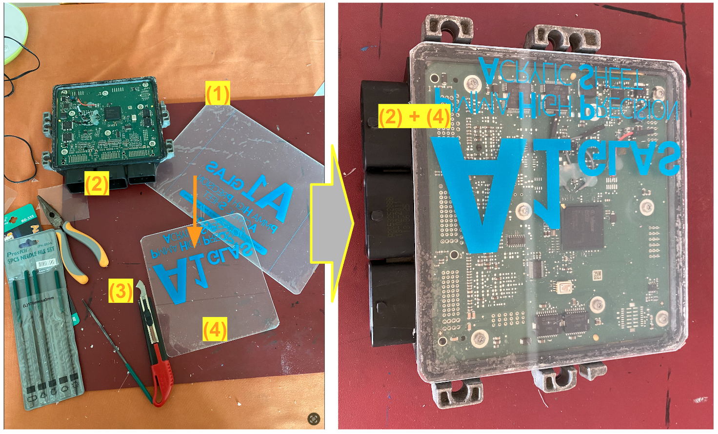 차량에 중고 ECU 장착하려고 보니, 뚜껑이 없는 상태라 고장 위험도 있고해서 덮개를 직접 만들어 보기로 했습니다.(유튜브에서 본것입니다.) 절차) (1) A4 크기의 플라스틱 준비 (쿠팡에서 구매) (2) 배선 솔더링 완료된 중고 ECU (3) 플라스틱 커터칼 준비 (쿠팡 구매) (4) 엔진 ECU 덮개 크기로 절단: A4 크기의 플라스틱판 위에 ECU를 뒤집어서 놓고 밑그림 그린후 절단 --> (2)+(4)는 절단한 플라스틱 뚜껑을 엔진 ECU에 올려 놓은 것입니다. (5) 플라스틱 뚜껑 모따기 (줄 활용) (6) 솔더링된 배선을 외부로 빼기 위한 구멍 만들기 (7) 위의 (6)번 작업시 만든 구멍으로 배선 빼기 (8) 구멍으로 물이나 이물질이 들어가지 않도록 글루건으로 봉합해줍니다. (배선 고정 역..